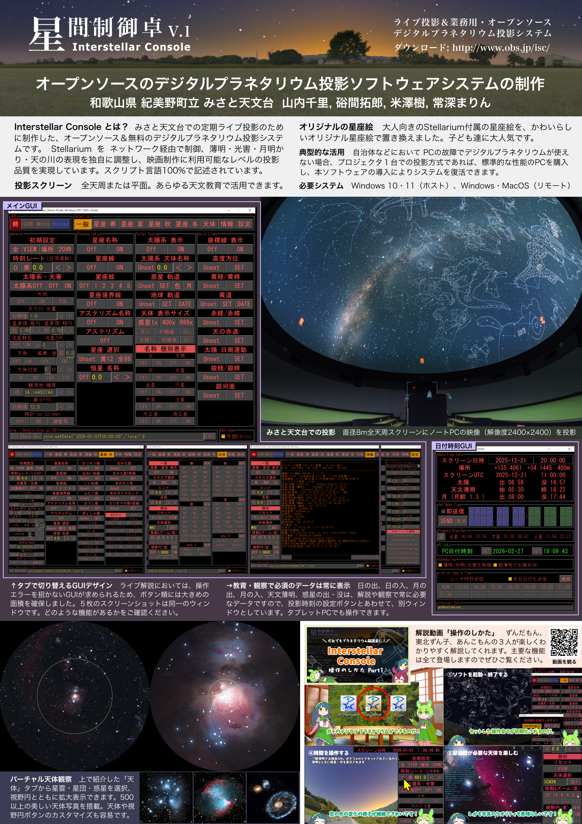 Interstellar Consoleは、みさと天文台での定期ライブ投影のために職員が自ら制作した、オープンソース&無料のデジタルプラネタリウム投影システムです。 Stellarium を ネットワーク経由で制御、星の描画を独自に調整する事により、映画制作に利用可能なレベルの投影品質を実現しています。